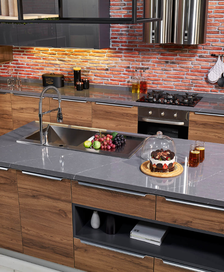 While providing great convenience in the kitchen with its island countertop and large sink, you can feel comfort and elegance together with ergonomic cabinets as well as showcases that you can decorate as you wish.