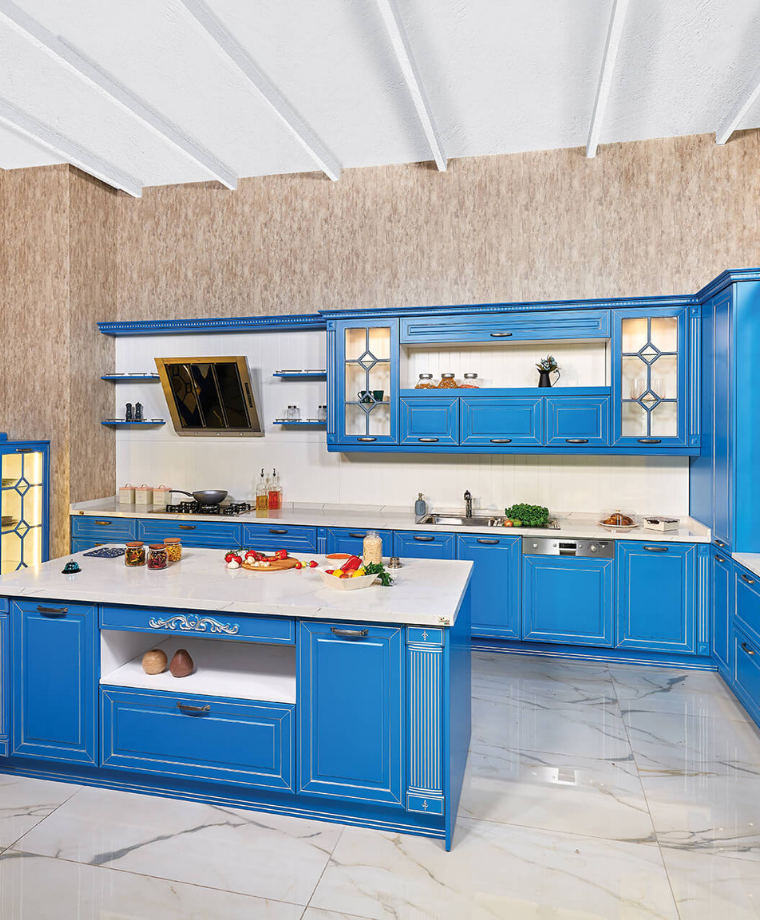 Klasik tarzı ve cam rafları ile Marine, mutfağına renk katmak isteyenler için ideal bir seçim.